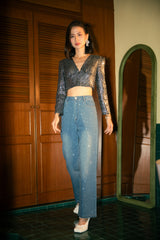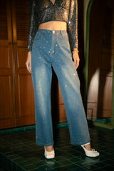 Inspired by Colleen Corby, the teen fashion icon. This era the college youth "hippies" favored a more relaxed and comfortable fit which was the blue jeans. Colleen was one of the eras models who is known to advertise jeans amongst the youth driven crowd. With her as an inspiration and with the perspective of evolution we bring you a bedazzled pair of high waist jeans that elevates denim to glamor. This piece is covered with rhinestones and catches the light at every turn. Pair it with our Katharine Top for a party night out or pair it more casually with a baby-t.