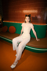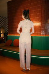 Inspired by the supermodel and actress, Brigette Bardot's style. She enjoys a more androgynous and cool aesthetic and embraces sheer material nude look. With that we present you with our sheer embellished top and pants lined with nude colored fabric. A very intricate look fully adorned with beadings and sequins. Put it on and you will feel like you are dripping in jewels. A collectors set that is perfect for a night to remember.