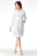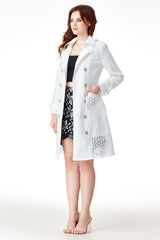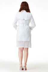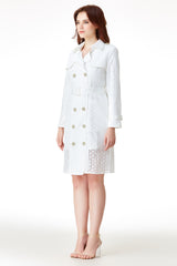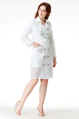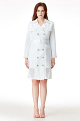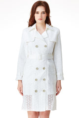Classic styling keeps the look refined and timeless for a double-breasted and unique embroidered trench coat in a three-quarter-length silhouette.