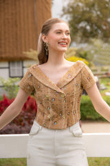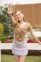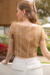 This design combines masculinity and femininity, using the lapel in men's wear and a double breasted coat silhouette with gold flower statement buttons. The femininty element is from the luxurious tweed material used. It is embellished with iridescent sequins and beads resembling the blooms of the meadow and the sparkles it emanate when the sun's ray strike the morning dew creating a dazzling visual effect of sparkly rainbows. Sparkle away in this top top to a luncheon when matched with the Dakota Skort or the Berta Bow Pants for a dinner meeting.