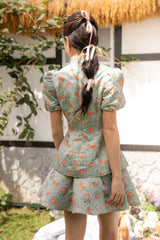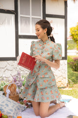 At Duchess & Co, it’s all in the details. This qipao top features a graceful scalloped collar that flows seamlessly down the placket, with the hem adorned in a sparkling chain of rhinestones. The Bella Qipao Set pairs this charming puff-sleeved top with a playful mini skater skirt, creating a look that’s both youthful and luxe.