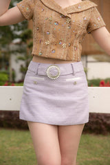 A casual yet sparkly skort designed for everyday wear. Created to stand out while keeping comfort at the forefront, this piece is crafted from a unique woven light fabric subtly embellished with silver sequins throughout. Featuring a skirt façade in the front and shorts in the back, it offers the perfect blend of style and ease. The look is completed with a rhinestone belt for an added touch of shine. Pair this skort with the Amber Top, Grace Off-Shoulder Top, or Sansa Top for a chic, effortless outfit—ideal for a casual lunch with friends or family.