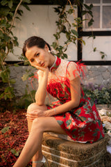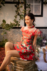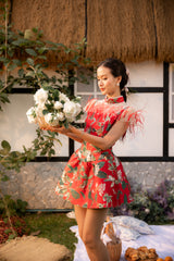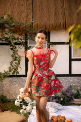 A delightful design inspired by the meadows. The motifs on the brocade tells the story of the melodious birds chirping in a cozy meadow of flowers. A playful design with a skater skirt on a drop waist waistline, giving a youthful allure. This piece is adorned with hand stitched pearls on the neckline, pearls and beadings on sheer fabric around the chest area and finally completed with hand stitched ostrich feathers onto the sleeves and neckline.
