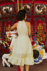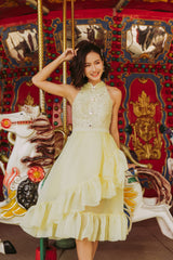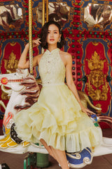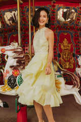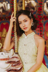 Shine in this glittering dress and you will be the headturner of the room. This glamorous piece is made with a combination of brocade fabric layered with an embellished net and finished off with a cascading silky organza skater skirt. We adorned this piece with pearl detailing and diamante buttons. We love this dreamy piece.