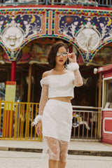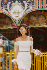 A ruched off-shoulder tulle embellished beauty combined with ostrich feather sleeves. A versatile favorite piece in this collection that can be matched with a sleek pair of pants, a mini skirt, a pencil skirt, or even a pair of shorts. The endless possibilities of styling this top make it a glamorous staple in your closet especially if you like standing out in a crowd.