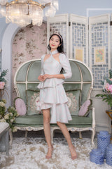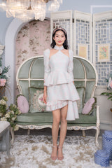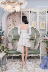 Steal the show in this dramatic puff sleeve top fashioned with a pleated high neck and asymmetrical tiered ruffle silhouette. This is the perfect combination between the orient and the west.