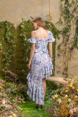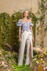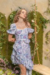 Enchanting blooms highlight the charm on this shapely corset fit top, styled with puffed sleeves and a sweetheart neckline.