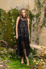 SS'19 Embroidered Mesh Pleated Maxi Dress - Black