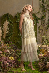 Make a memorable entrance in this embroidered bodice of a wispy tulle dress with a beautifully pleated hem that's destined to steal the scene.