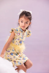 This is the multi-way Mini-Me version of our Bunny & Feather Qipao Dress. This adorable piece is made with our custom bunny in-house print and adorned with feathers and fur details. This look can be worn a second way by removing the feathers and fur. Look absolutely adorable in this matching look with your little girl!