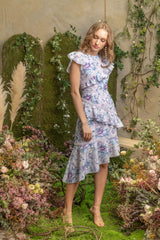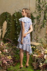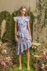 Ruffles and fluttery sleeves add sweetly soft structure to this simply sophisticated dress designed to swish and sway with each step.