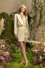 A faux-wrap dress with layers of voluminous ruffles on one side, this mini-length style dress is a vision of elegance and style.