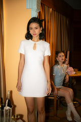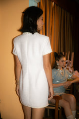 The day version of the Twiggy Dress. Inspired by the famous 60's super model Twiggy that is always in shift dresses. This piece is an everday look with a touch of sophistication. The neckline, hemline and sleeve hem is adorned with pearls and beadings. Look closely at our tweed material and you will see subtle silver threads that shines when it catches the light. This piece does NOT have sequin and beadings on the tweed fabric, a material option for those who prefer a more subtle everyday dress.